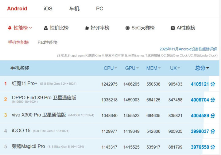 作为对比,在安兔兔跑分排行榜(2025.11)上,跑分最高的红魔11 Pro+,为410万分。