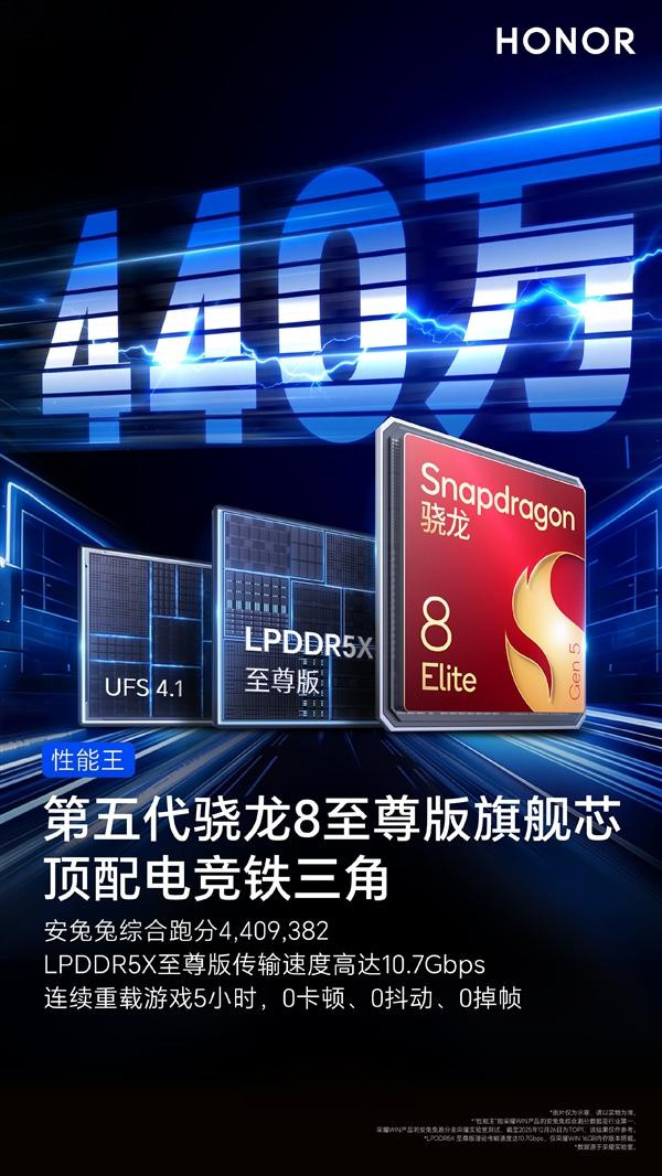荣耀WIN搭载高通当下最强的第五代骁龙8至尊版,以及LPDDR5X至尊版,和UFS 4.1的“电竞铁三角”性能组合,安兔兔跑分达到了440万分,稳居行业第一。
